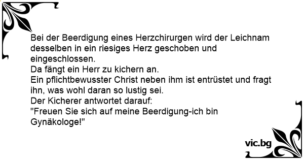 Auf dem Friedhof wird ein Herzspezialist beerdigt. Der Sarg steht vor einem riesigen, überdimensionalem Herz. Der Pfarrer hält seine Rede. Als er fertig ist und alle Abschied genommen haben, klappt...