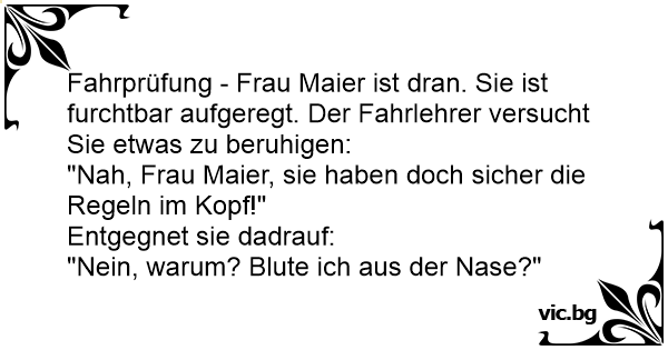 Fahrprüfung - Frau Maier ist dran. Sie ist furchtbar aufgeregt. Der Fahrlehrer versucht Sie etwas zu beruhigen: