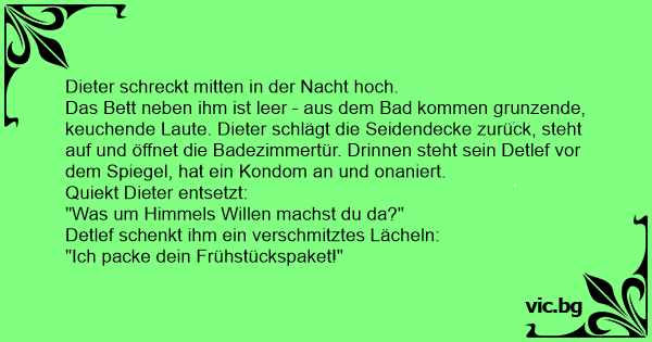 Das Bett neben ihm ist leer - aus dem Bad kommen grunzende, keuchende Laute. Dieter schlägt die Seidendecke zurück, steht auf und öffnet die Badezimmertür. Drinnen steht sein Detlef vor dem Spiegel, hat ein Kondom an und onaniert.