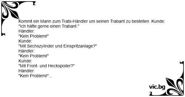 Kommt ein Mann zum Trabi-Händler um seinen Trabant zu bestellen. Kunde: