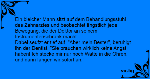 Dabei seufzt er tief auf. "Aber mein Bester", beruhigt ihn der Dentist, "Sie brauchen wirklich keine Angst haben! Ich stecke mir nur noch Watte in die Ohren, und dann fangen wir sofort an."
