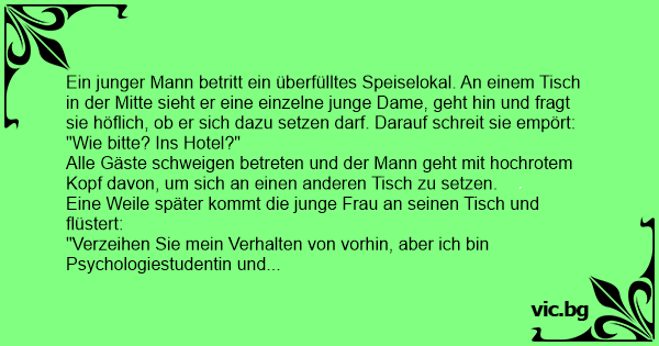 Die hübsche junge Dame sitzt allein im Cafe. Ein Mann vom Nachbartisch kommt herüber und fragt: "Verzeihen Sie, darf ich Sie zu einem Drink einladen?" "Waas, ins Hotel?!" schreit sie auf. "Nein, nein, das ist ein Missverständnis ich wollte sie nur auf einen Drink einladen." "Waas, ins Hotel?!"...