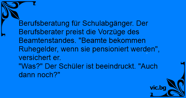 Berufsberatung für Schulabgänger. Der Berufsberater preist die Vorzüge des Beamtenstandes. "Beamte bekommen Ruhegelder, wenn sie pensioniert werden", versichert er.