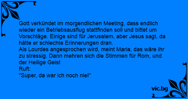 Gott verkündet im morgendlichen Meeting, dass endlich wieder ein Betriebsausflug stattfinden soll und bittet um Vorschläge. Einige sind für Jerusalem, aber Jesus sagt, da hätte er schlechte Erinnerungen dran.