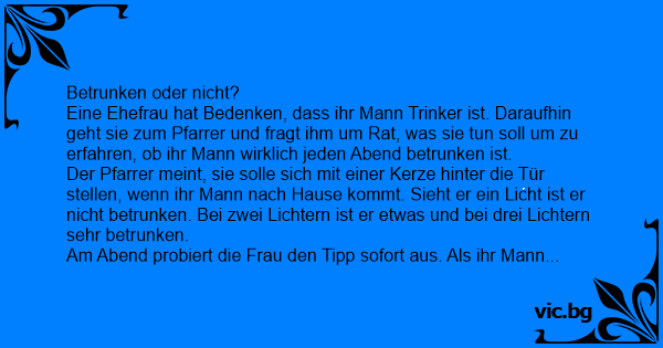 Der Pfarrer meint, sie solle sich mit einer Kerze hinter die Tür stellen, wenn ihr Mann nach Hause kommt. Sieht er ein Licht ist er niсhт betrunken. Bei zwei Lichtern ist er etwas und bei drei Lichtern sehr betrunken.