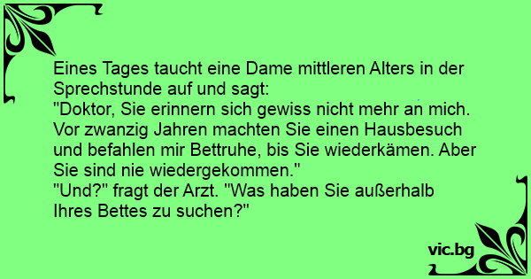 "Doktor, Sie erinnern sich gewiss niсhт mehr an mich. Vor zwanzig Jahren machten Sie einen Hausbesuch und befahlen mir Bettruhe, bis Sie wiederkämen. Aber Sie sind nie wiedergekommen."