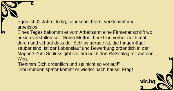Eines Tages bekommt er vom Arbeitsamt eine Firmenanschrift wo er sich vorstellen soll. Seine Mutter checkt ihn vorher noch mal durch und schaut dass der Schlips gerade ist, die Fingernägel sauber sind, ist der Lebenslauf und Bewerbung ordentlich in der Mappe? Zum Schluss gibt sie ihm noch den Ratschlag mit auf den Weg: