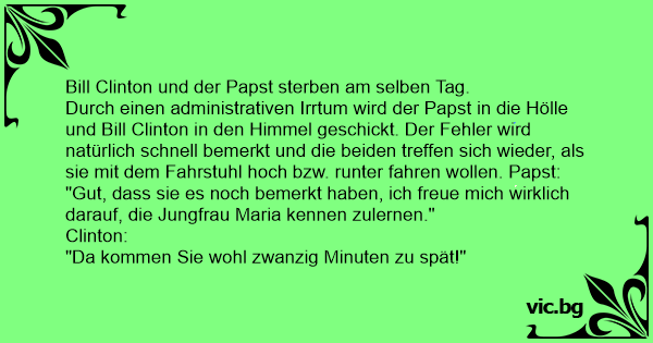 Durch einen administrativen Irrtum wird der Papst in die Hölle und Bill Clinton in den Himmel geschickt. Der Fehler wird natürlich schnell bemerkt und die beiden treffen sich wieder, als sie mit dem Fahrstuhl hoch bzw. runter fahren wollen. Papst: