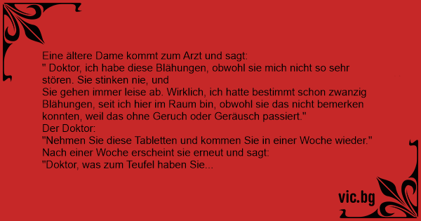 Kommt eine ältere Dame zum Arzt und sagt: "Sie, ich muss immer viele kleine Fürze lassen, aber das mach nichts, die stinken nicht und hören tut man sie auch nicht! Sehen Sie, seit ich hier bei Ihnen bin, habe ich bestimmt schon 10 mal gefurzt!" Da holt der Arzt eine Schachtel Tabletten hervor...
