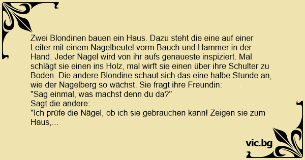 Zwei Blondinen bauen ein Haus. Dazu steht die eine auf einer Leiter mit einem Nagelbeutel vorm Bauch und Hammer in der Hand. Jeder Nagel wird von ihr aufs genaueste inspiziert. Mal schlägt sie einen ins Holz, mal wirft sie einen über ihre Schulter zu Boden. Die andere Blondine schaut sich das eine halbe Stunde an, wie der Nagelberg so wächst. Sie fragt ihre Freundin: