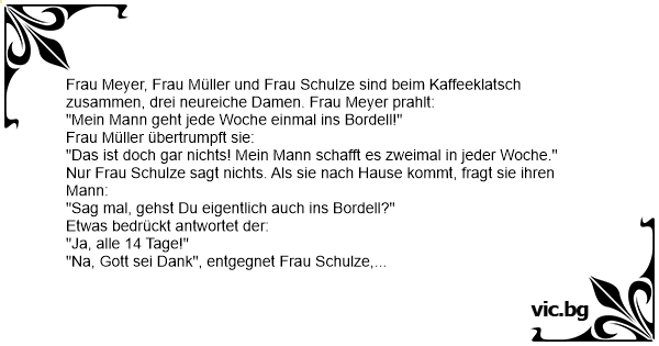 Frau Meyer, Frau Müller und Frau Schulze sind beim Kaffeeklatsch zusammen, drei neureiche Damen. Frau Meyer prahlt: