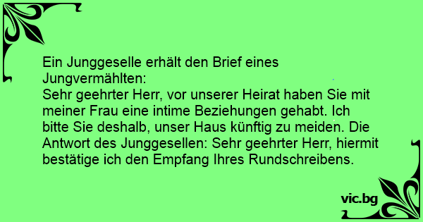 Sehr geehrter Herr, vor unserer Heirat haben Sie mit meiner Frau eine intime Beziehungen gehabt. Ich bitte Sie deshalb, unser Haus künftig zu meiden. Die Antwort des Junggesellen: Sehr geehrter Herr, hiermit bestätige ich den Empfang Ihres Rundschreibens.