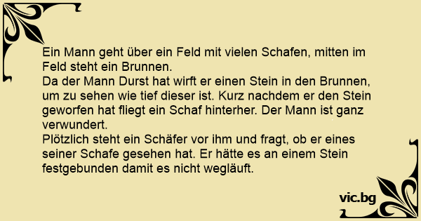 Da der Mann Durst hat wirft er einen Stein in den Brunnen, um zu sehen wie tief dieser ist. Kurz nachdem er den Stein geworfen hat fliegt ein Schaf hinterher. Der Mann ist ganz verwundert.