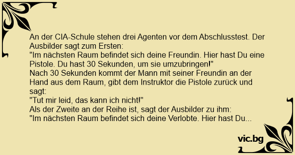Egzamin w szkole agentów CIA. Do sali wchodzi student. Instruktor mówi: - W pokoju obok znajduje się Twoja dziewczyna. Tu masz pistolet. Masz ją zabić w 30 sekund. Po 30 sekundach student wraca i mówi: - Sorry, nie mogłem tego zrobić. Kolejny student....