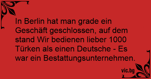 In Berlin hat man grade ein Geschäft geschlossen, auf dem stand Wir bedienen lieber 1000 Türken als einen Deutsche - Es war ein Bestattungsunternehmen.