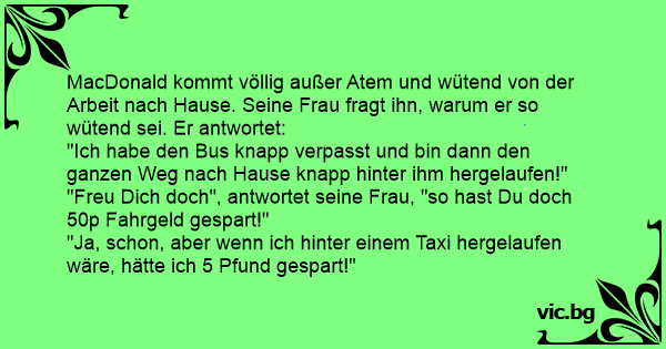 "Ja, schon, aber wenn ich hinter einem Taxi hergelaufen wäre, hätte ich 5 Pfund gespart!"