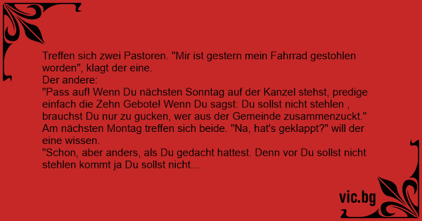 "Schon, aber anders, als Du gedacht hattest. Denn vor Du sollst niсhт stehlen kommt ja Du sollst niсhт ehebrechen und da fiel mir ein, wo ich mein Fahrrad stehen lassen habe."