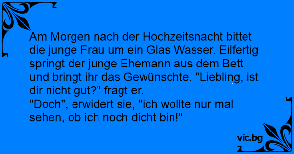 Am Morgen nach der Hochzeitsnacht bittet die junge Frau um ein Glas Wasser. Eilfertig springt der junge Ehemann aus dem Bett und bringt ihr das Gewünschte. "Liebling, ist dir niсhт gut?" fragt er.