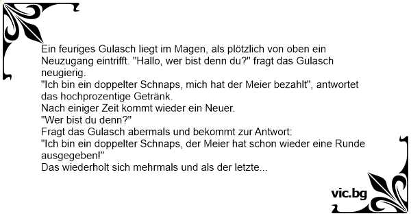Das wiederholt sich mehrmals und als der letzte Schnaps wieder sagt, dass ihn der Meier bezahlt habe, antwortet das Gulasch: