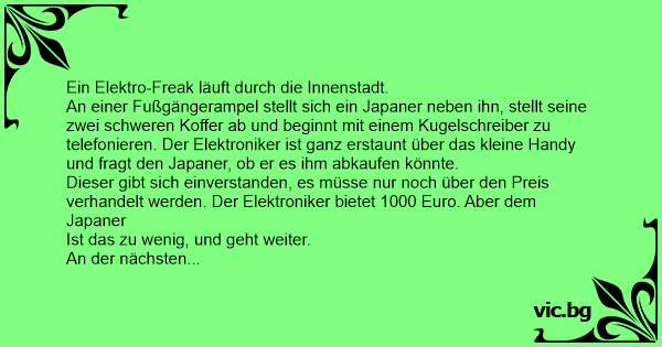 An einer Fußgängerampel stellt sich ein Japaner neben ihn, stellt seine zwei schweren Koffer ab und beginnt mit einem Kugelschreiber zu telefonieren. Der Elektroniker ist ganz erstaunt über das kleine Handy und fragt den Japaner, ob er es ihm abkaufen könnte.