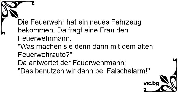 Die Feuerwehr hat ein neues Fahrzeug bekommen. Da fragt eine Frau den Feuerwehrmann: