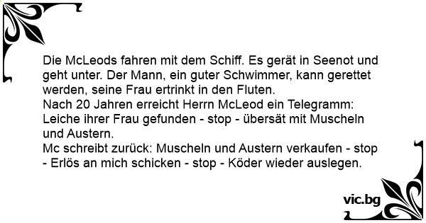 Nach 20 Jahren erreicht Herrn McLeod ein Telegramm: Leiche ihrer Frau gefunden - stop - übersät mit Muscheln und Austern.