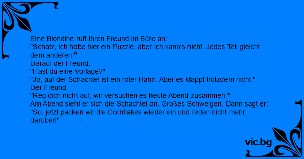 Eine Blondine ruft ihren Freund bei der Arbeit an. Sie sagt: „ich mache da ein Puzzle aber ich krieg es nicht hin.“ fragt der Freund „Hast du eine Vorlage?“ Sagt sie ja, da ist ein roter Hahn drauf...