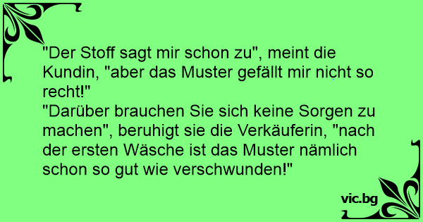 "Darüber brauchen Sie sich keine Sorgen zu machen", beruhigt sie die Verkäuferin, "nach der ersten Wäsche ist das Muster nämlich schon so gut wie verschwunden!"