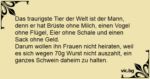 Das traurigste Tier der Welt ist der Mann, denn er hat Brüste ohne Milch, einen Vogel ohne Flügel, Eier ohne Schale und einen Sack ohne Geld.