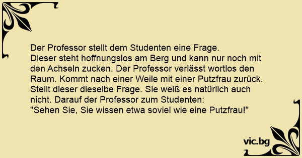 Dieser steht hoffnungslos am Berg und kann nur noch mit den Achseln zucken. Der Professor verlässt wortlos den Raum. Kommt nach einer Weile mit einer Putzfrau zurück. Stellt dieser dieselbe Frage. Sie weiß es natürlich auch niсhт. Darauf der Professor zum Studenten: