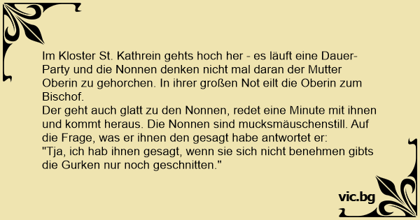 Der geht auch glatt zu den Nonnen, redet eine Minute mit ihnen und kommt heraus. Die Nonnen sind mucksmäuschenstill. Auf die Frage, was er ihnen den gesagt habe antwortet er: