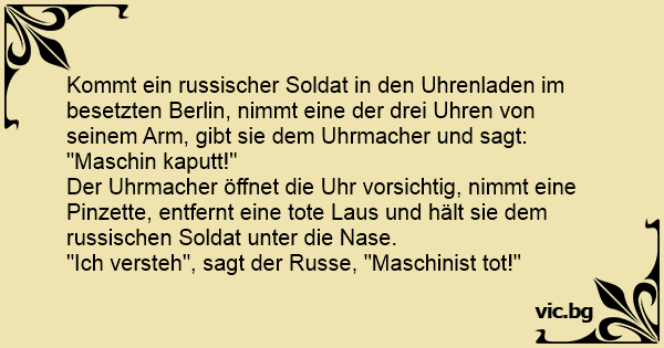 Kommt ein russischer Soldat in den Uhrenladen im besetzten Berlin, nimmt eine der drei Uhren von seinem Arm, gibt sie dem Uhrmacher und sagt: