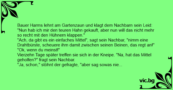 "Ach, da gibt es ein einfaches Mittel", sagt sein Nachbar, "nimm eine Drahtbürste, scheuere ihm damit zwischen seinen Beinen, das regt an!"
