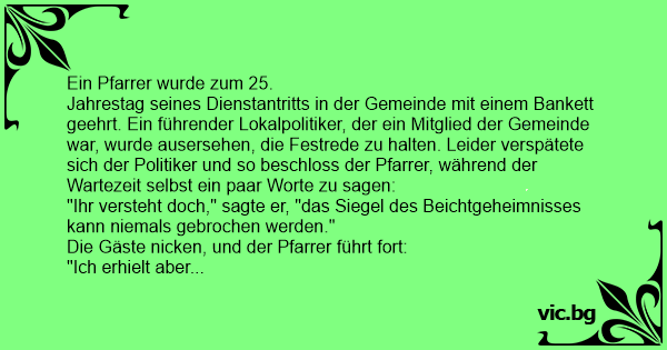 Jahrestag seines Dienstantritts in der Gemeinde mit einem Bankett geehrt. Ein führender Lokalpolitiker, der ein Mitglied der Gemeinde war, wurde ausersehen, die Festrede zu halten. Leider verspätete sich der Politiker und so beschloss der Pfarrer, während der Wartezeit selbst ein paar Worte zu sagen: