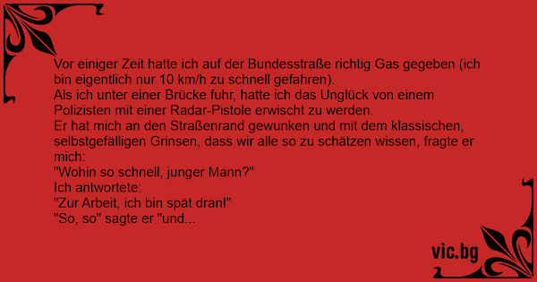 Er hat mich an den Straßenrand gewunken und mit dem klassischen, selbstgefälligen Grinsen, dass wir alle so zu schätzen wissen, fragte er mich:
