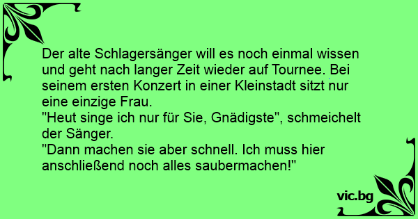 Der alte Schlagersänger will es noch einmal wissen und geht nach langer Zeit wieder auf Tournee. Bei seinem ersten Konzert in einer Kleinstadt sitzt nur eine einzige Frau.