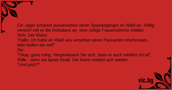 Zwei Jäger gehen durch den Wald, als einer von ihnen plötzlich zusammenbricht. Er scheint nicht zu atmen, seine Augen sind glasig. Der andere Jäger greift zu seinem Mobiltelefon und betätigt den Notruf. "Ich glaube mein Freund ist tot. Was soll ich tun?", fragt er in Panik. "Ganz ruhig",...
