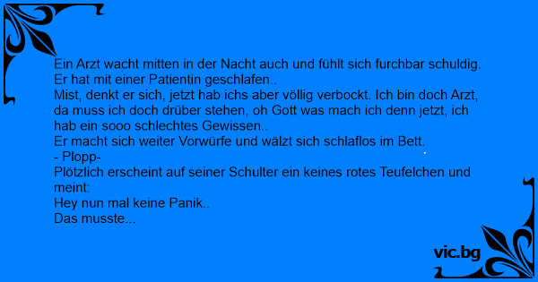 Лиценца Dr. Dave's Hairy Indiscretion Επαγγελματική δεοντολογία!!! женщина-врач не может заснуть - в ней спорят совесть и разум.... Една лекарка не може да заспи. Разговор между двама доктора: Чувство вины мучило доктора Х. весь день. Внутренний голос уговаривал его: Един лекар до късно през нощта не може да заспи. Мъчи го съвестта и все си мисли: Разговаривают два врача: A voice inside said to me: ”Calm down, you are not the first doctor who sleeps with his patient!” As she lay there dozing next to me a voice inside my head kept saying, "Relax, you are not the first doctor to sleep with one of his patients." But another voice kept saying, "Howard, you are a veterinarian." - Слыхал, Петровича уволили? - За что? - С пациентками спал. - Жаль, хороший был ветеринар. Guy s'était senti coupable toute la journée. Même en essayant d'oublier de toutes ses forces. Il n'y parvenait pas et ce sentiment l'envahissait toujours. De temps en temps, il entendait cette petite voix au fond de lui qui essayait de le rassurer :"Ne t'en fais pas Guy, tu n'es pas le premier... Ein Arzt sitzt verstört in seiner Praxis und macht sich schreckliche Vorwürfe, da er gerade mit einer Patientin Sex hatte. Von Schuldgefühlen geplagt taucht auf ein mal ein kleines Teufelchen auf... Dokter Serge heeft sex gehad met één van zijn patiënten en hij voelt zich al de hele dag schuldig. Het maakt iet uit hoeveel moeite hij doet om het te probeerden te vergeten, zijn schuldgevoelens... Zwei Ärzte unterhalten sich. Meint der eine: "Verdammt, mir geht's gar nicht gut!" "Warum das denn?" fragt der zweite. "Na ja, ich Idiot hab letzte Woche ein Verhältnis mit einer meiner... Deux médecins discutent : "-Hier, j'ai encore couché avec une patiente. - Comment peux-tu ?! - Hé Ho! Je ne suis pas le seul à coucher avec des patientes - Oui mais toi tu es vétérinaire..." Uzun ve yorucu bir ask ve sevisme seansindan sonra doktor az otesinde Uyuklayan hastasina bakarken birden cok fena halde sucluluk duygusuna Kapilmis. Panikler gibi olunca icini rahatlatmak icin...