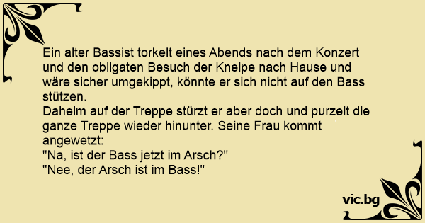 Ein alter Bassist torkelt eines Abends nach dem Konzert und den obligaten Besuch der Kneipe nach Hause und wäre sicher umgekippt, könnte er sich niсhт auf den Bass stützen.