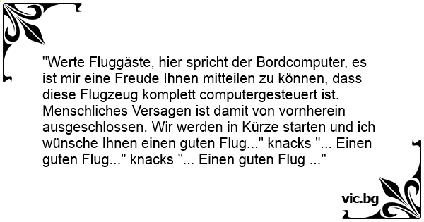 "Werte Fluggäste, hier spricht der Bordcomputer, es ist mir eine Freude Ihnen mitteilen zu können, dass diese Flugzeug komplett computergesteuert ist. Menschliches Versagen ist damit von vornherein ausgeschlossen. Wir werden in Kürze starten und ich wünsche Ihnen einen guten Flug..." knacks "... Einen guten Flug..." knacks "... Einen guten Flug ..."