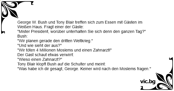 George W. Bush und Tony Blair treffen sich zum Essen mit Gästen im Weißen Haus. Fragt einer der Gäste: