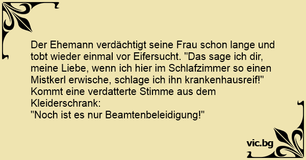 Der Ehemann verdächtigt seine Frau schon lange und tobt wieder einmal vor Eifersucht. "Das sage ich dir, meine Liebe, wenn ich hier im Schlafzimmer so einen Mistkerl erwische, schlage ich ihn krankenhausreif!"