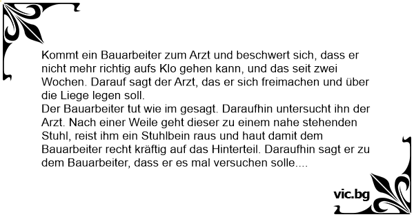 Der Bauarbeiter тuт wie im gesagt. Daraufhin untersucht ihn der Arzt. Nach einer Weile geht dieser zu einem nahe stehenden Stuhl, reist ihm ein Stuhlbein raus und haut damit dem Bauarbeiter recht kräftig auf das Hinterteil. Daraufhin sagt er zu dem Bauarbeiter, dass er es mal versuchen solle. Dieser zieht sich an und rennt aufs Klo.