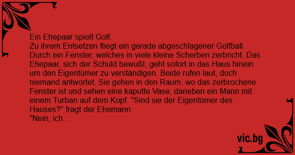 Zu ihrem Entsetzen fliegt ein gerade abgeschlagener Golfball Durch ein Fenster, welches in viele kleine Scherben zerbricht. Das Ehepaar, sich der Schuld bewußt, geht sofort in das Haus hinein um den Eigentümer zu verständigen. Beide rufen laut, doch niemand antwortet. Sie gehen in den Raum, wo das zerbrochene Fenster ist und sehen eine kaputte Vase, daneben ein Mann mit einem Turban auf dem Kopf. "Sind sie der Eigentümer des Hauses?" fragt der Ehemann.