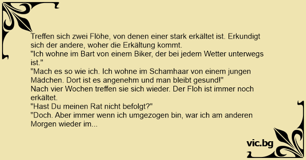 Treffen sich zwei Flöhe, von denen einer stark erkältet ist. Erkundigt sich der andere, woher die Erkältung kommt.