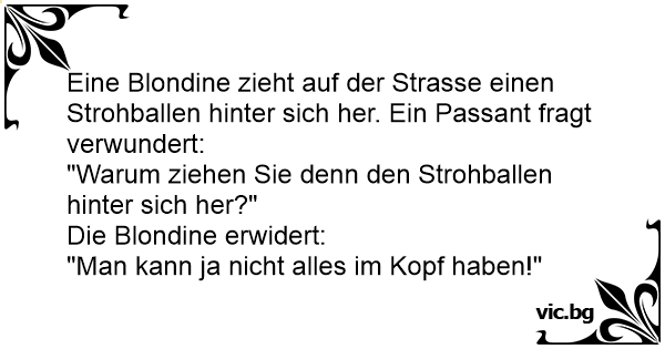 Eine Blondine zieht auf der Strasse einen Strohballen hinter sich her. Ein Passant fragt verwundert: