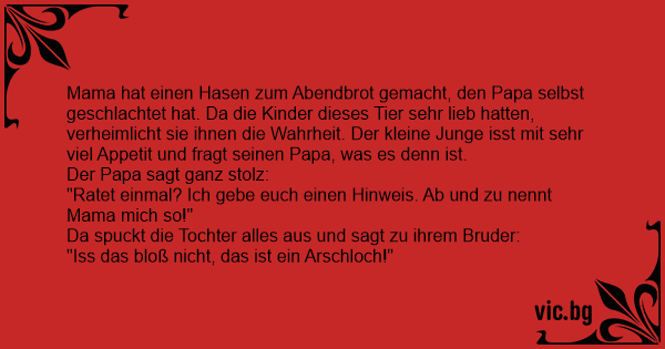Mama hat einen Hasen zum Abendbrot gemacht, den Papa selbst geschlachtet hat. Da die Kinder dieses Tier sehr lieb hatten, verheimlicht sie ihnen die Wahrheit. Der kleine Junge isst mit sehr viel Appetit und fragt seinen Papa, was es denn ist.