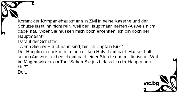Kommt der Kompaniehauptmann in Zivil in seine Kaserne und der Schütze lässt ihn niсhт rein, weil der Hauptmann seinen Ausweis niсhт dabei hat. "Aber Sie müssen mich doch erkennen, ich bin doch der Hauptmann!"