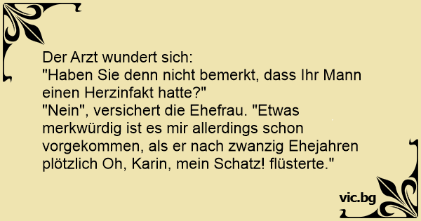 "Nein", versichert die Ehefrau. "Etwas merkwürdig ist es mir allerdings schon vorgekommen, als er nach zwanzig Ehejahren plötzlich Oh, Karin, mein Schatz! flüsterte."