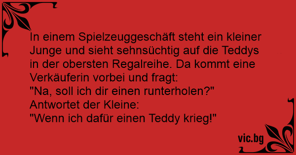 In einem Spielzeuggeschäft steht ein kleiner Junge und sieht sehnsüchtig auf die Teddys in der obersten Regalreihe. Da kommt eine Verkäuferin vorbei und fragt: